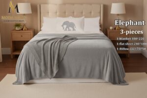 - غطاء (Blanket): مقاس 180 \times 220 سم، باللون الرمادي الفاتح، ويتميز بنسيج محبوك أو مضلع (Knitted/Ribbed).